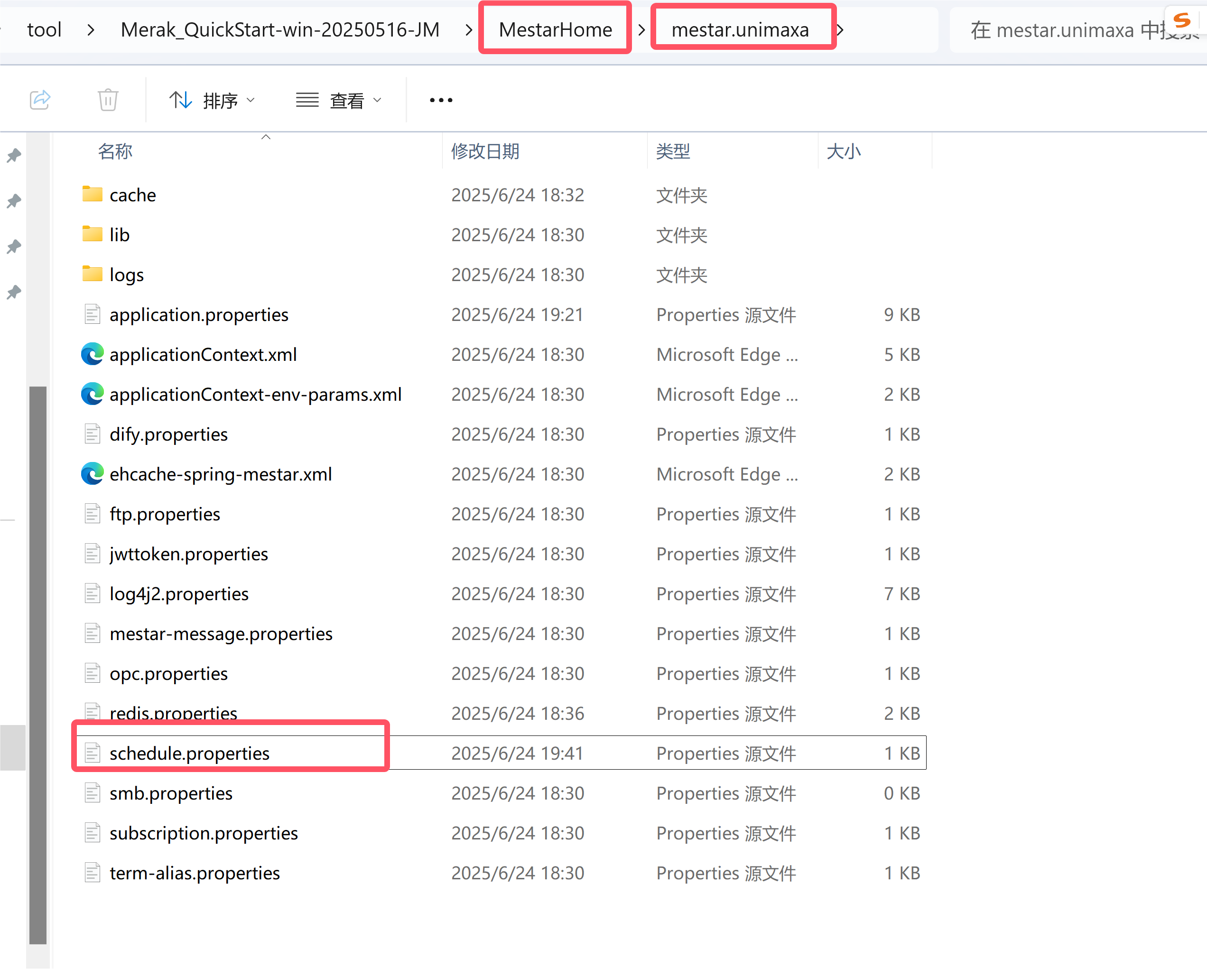 产品主要通过本配置文件自动触发任务单据的生成,若相关任务或单据没有自动触发生成,请检查schedule.properties 配置mestarSchedule是否正确,如果mestarSchedul=off,请改成mestarSchedul=on重新启动服务。schedule.properties文件标准路径为MestarHome\mestar.unimaxa,若修改了MestarHome路径,请按照自定义路径查找。