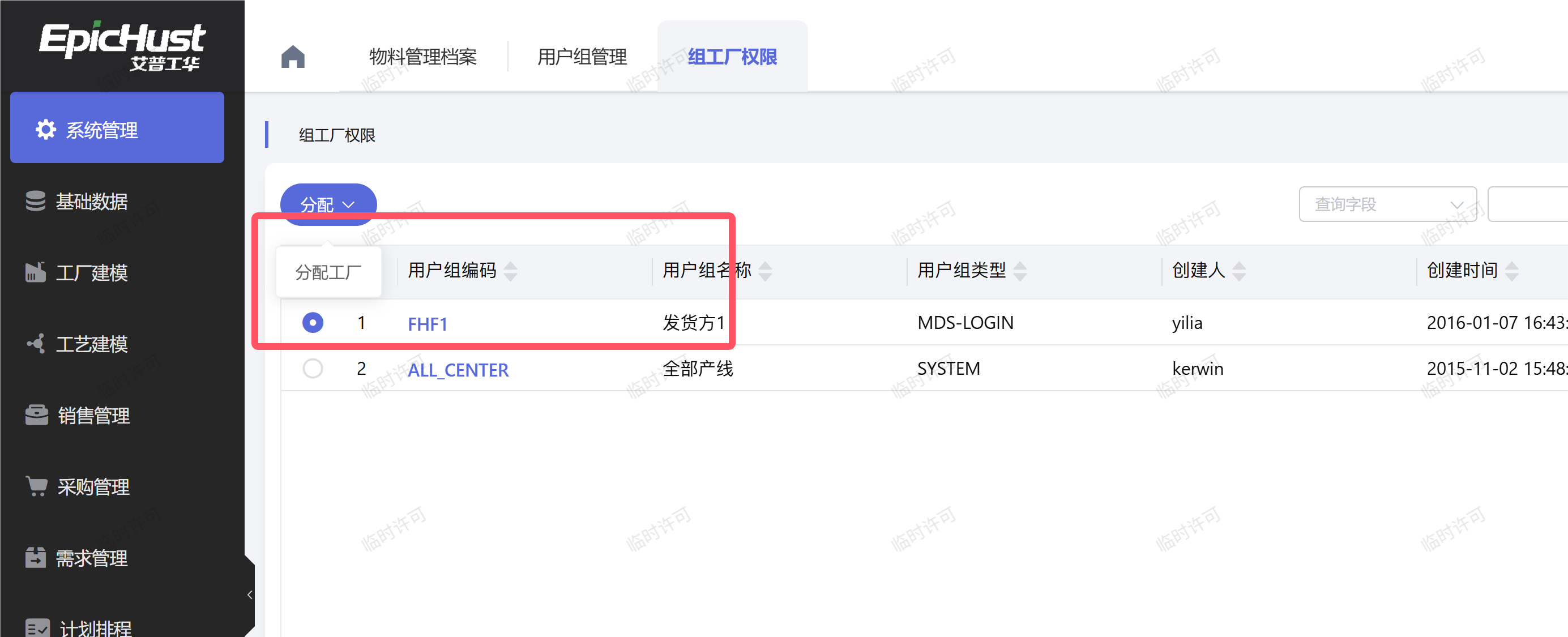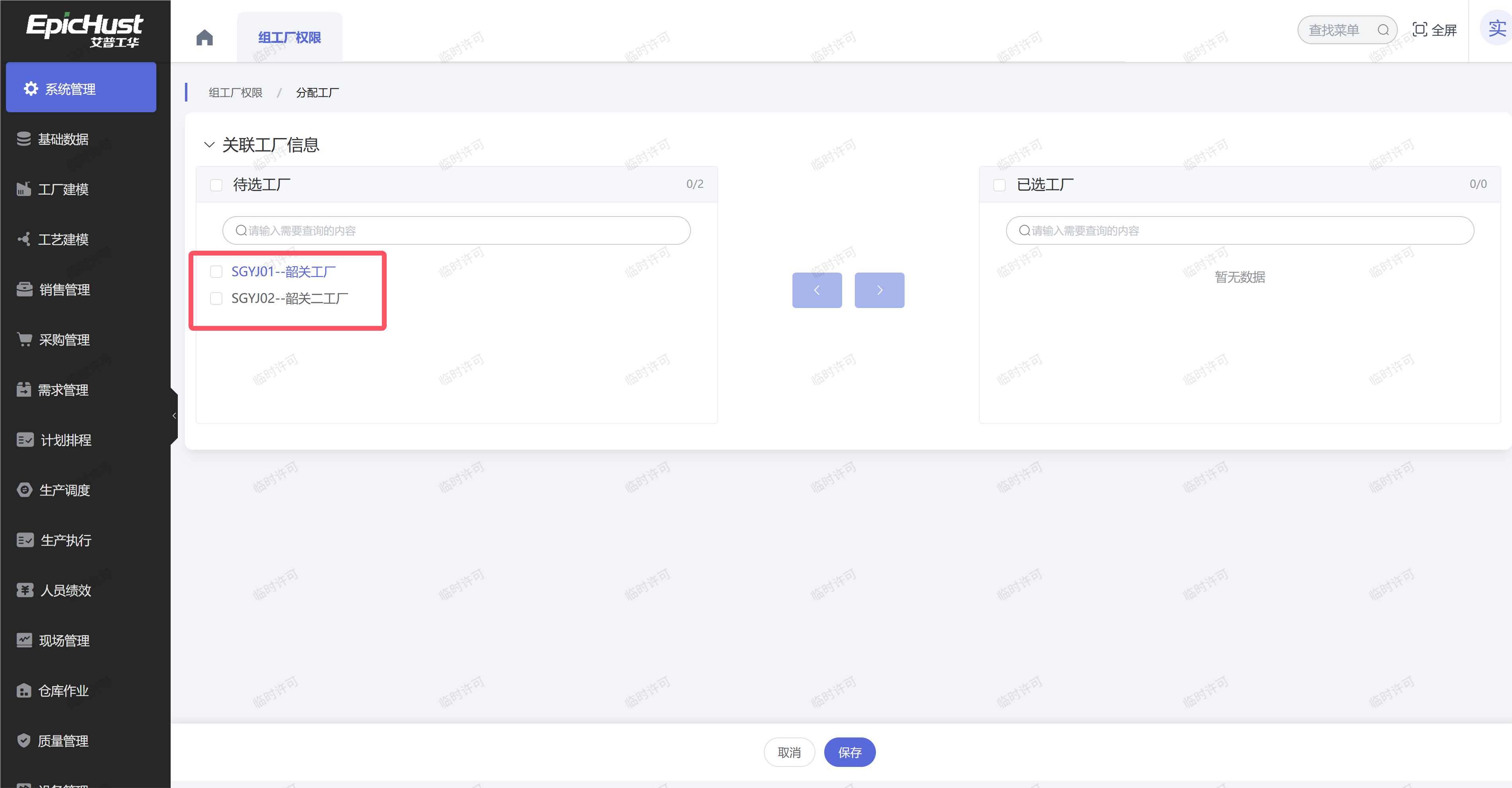 工厂的权限是否分配,在“系统管理”模块中找到“组工厂权限”,选择组名称为“全部产线”的数据,点击“分配”按钮中的“权限配置”按钮,将待分配的工厂,选择到右侧进行保存。