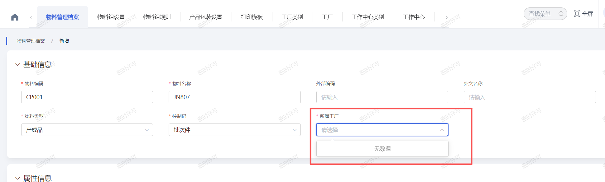 在物料管理档案新增物料时,“所属工厂”字段为空,不能选择相关工厂?