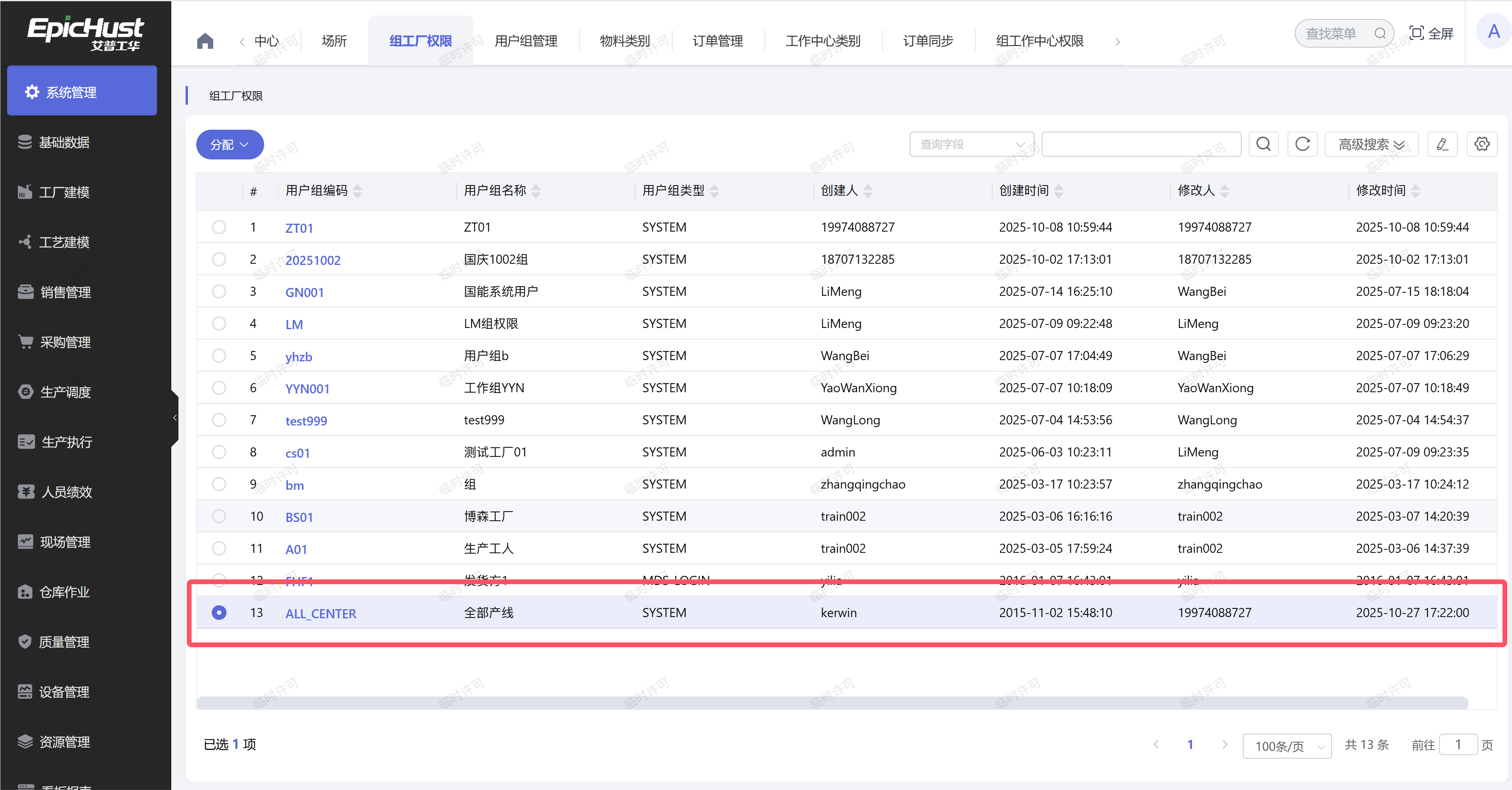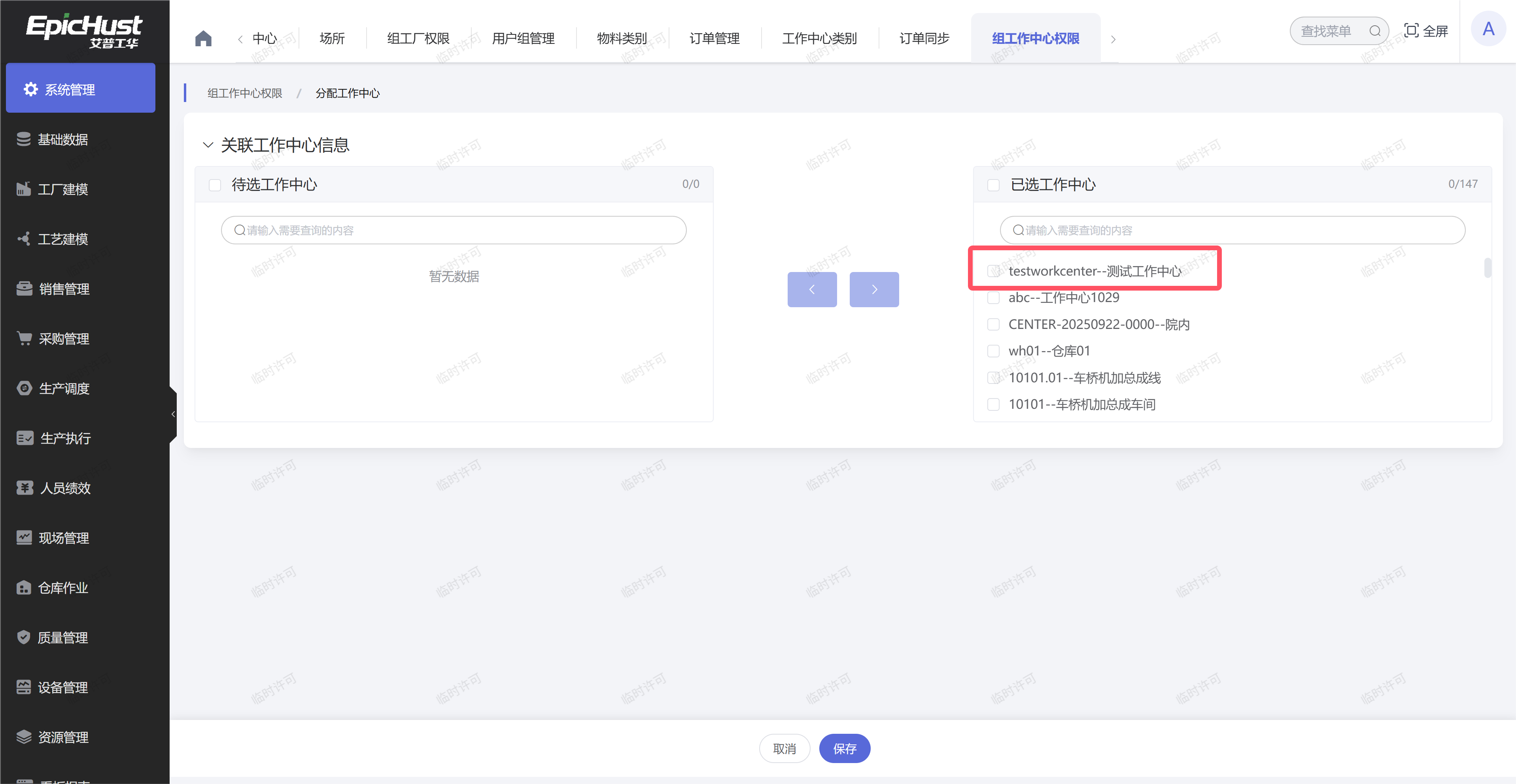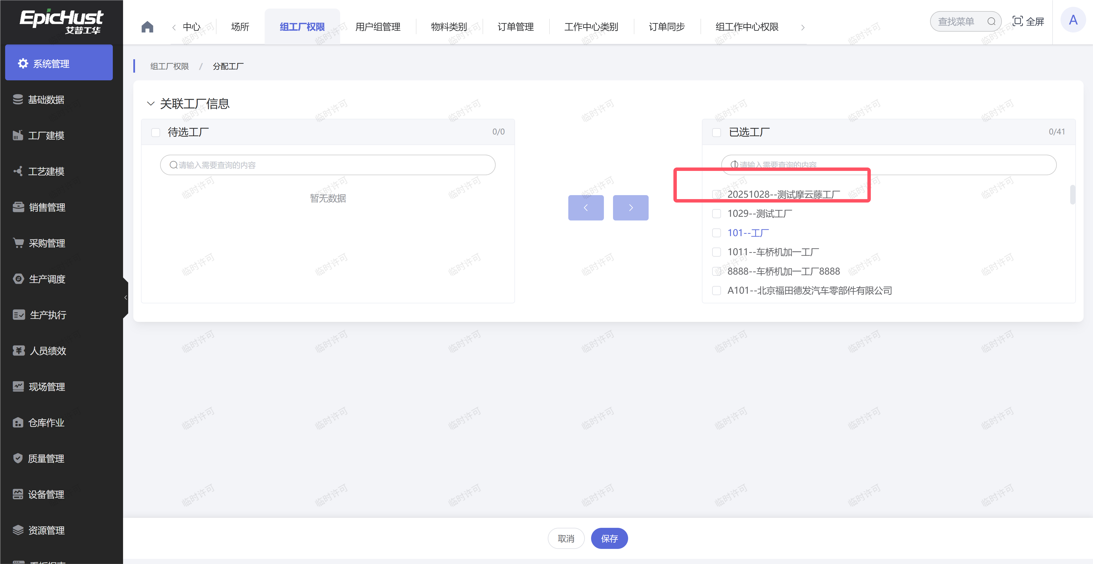 2.排查“工厂”的权限是否赋予:在系统管理模块中的“组工厂权限”界面中,选择“用户组名称”为“全部产线”的一行数据,点击“分配”按钮,看工厂是否选择到“已选工作中心”区域,如果不是,则将工厂从待选区域选择到已选区域中: