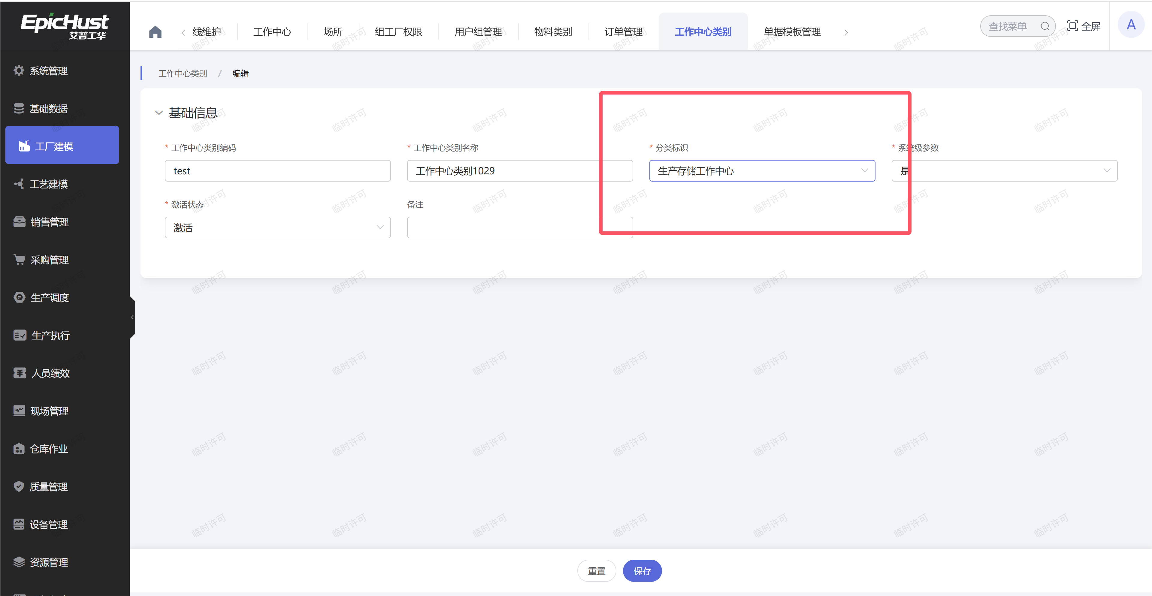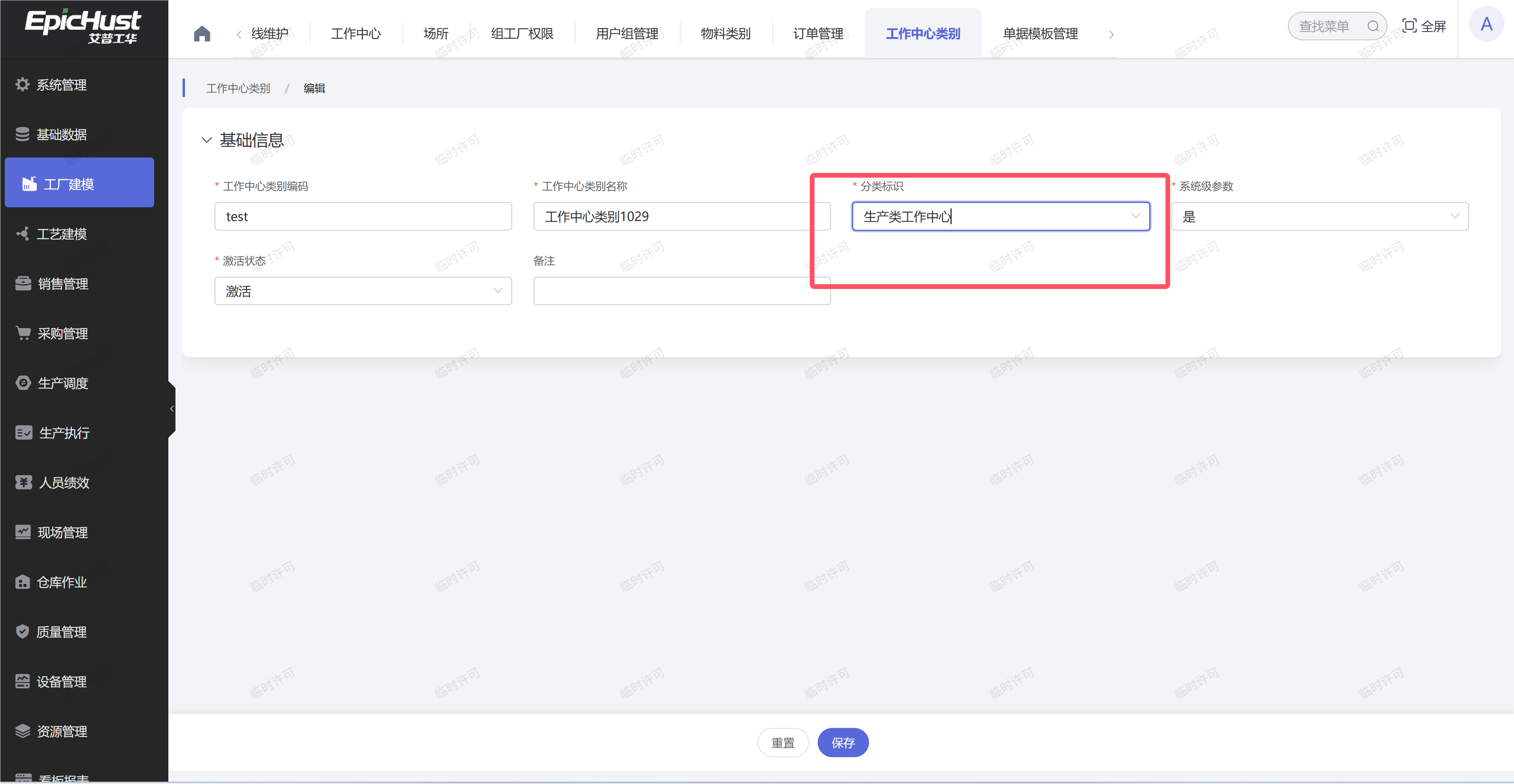 3.排查“工作中心类别”是否为“生产类工作中心”:在工厂建模模块中的“工作中心类别”界面中,查看“工作中心”所对应的“分类标识”字段是否为“生产类工作中心”,如果不是该分类标识,则通过“编辑”按钮修改成“生产类工作中心”。同时在“工作中心”界面,选择本“工作中心”,点击编辑按钮后,不做数据修改,直接点击“保持”按钮,即可。例如: