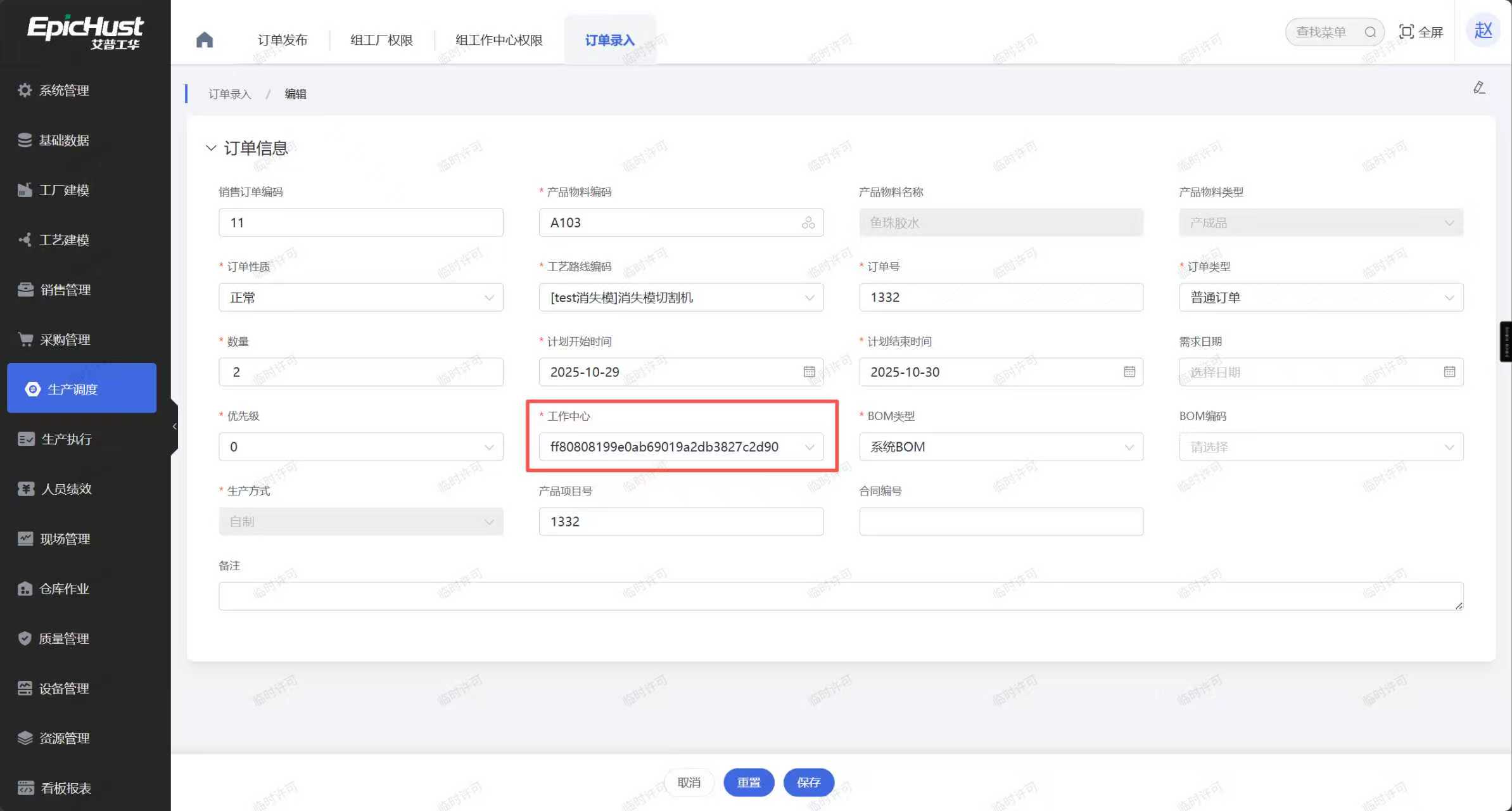 在“订单管理”或者“订单录入”的“新增”界面,通过“产品物料编码”查找带回“工作中心”数据时,“工作中心”字段为空或者显示一串数字(GID)。如下图所示: