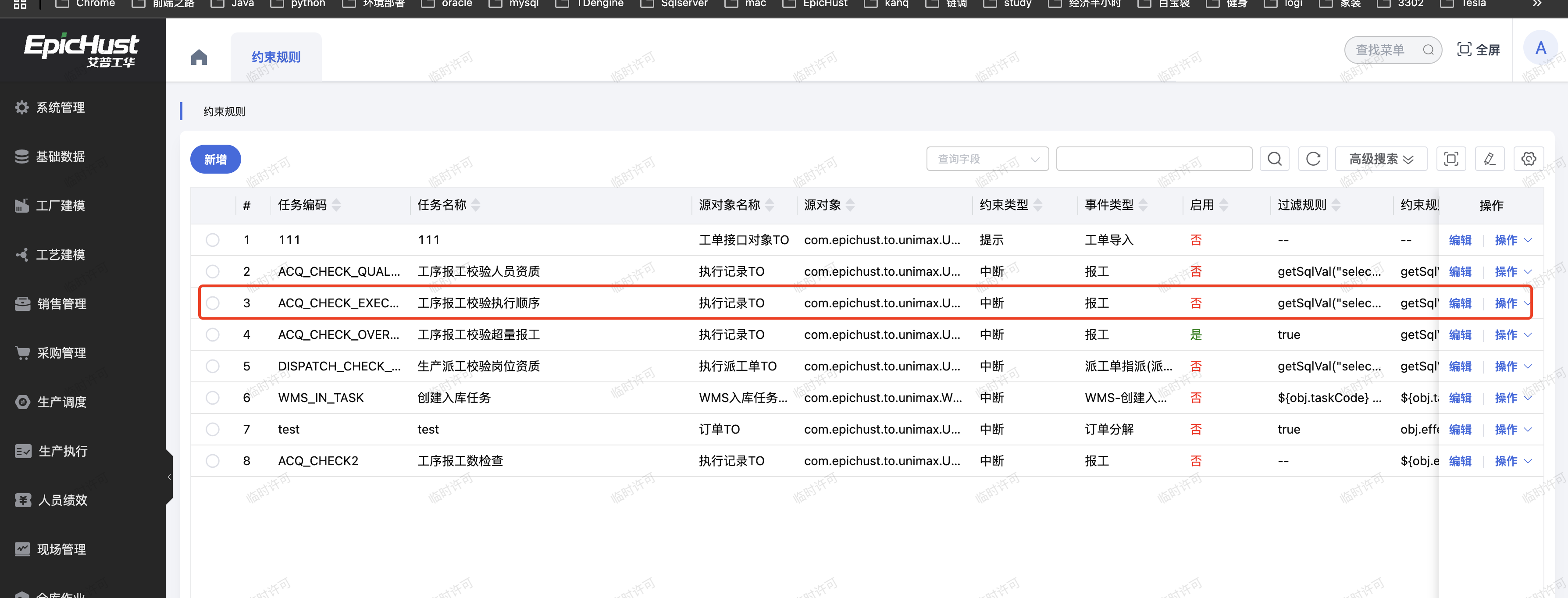 在客户化配置模块,进入“约束规则”界面中,选择“任务编码”为ACQ_CHECK_EXECUTION_SEQ的数据,然后点击行“操作”按钮中的“启用”按钮。如下图所示: