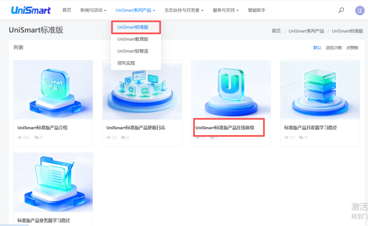 路径:UniSmart|学习成长中心——UniSmart系列产品——UniSmart标准版——UniSmart标准版产品在线体验