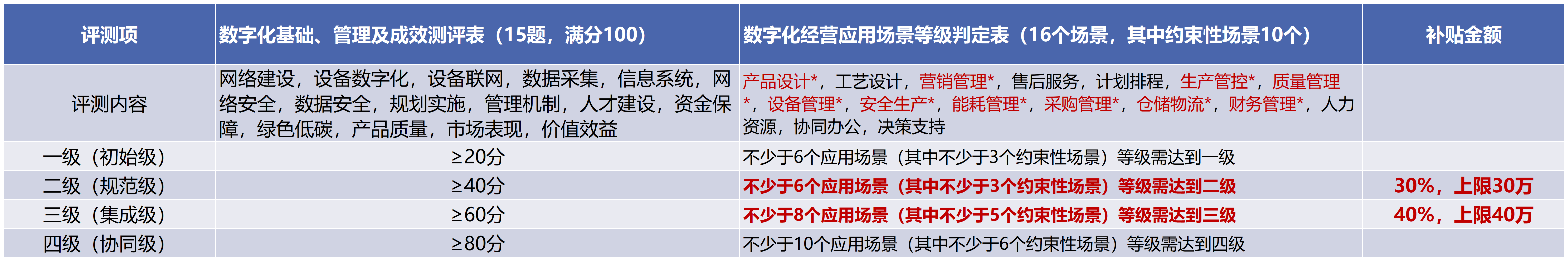 数转二级:数字化基础、管理及成效测评表≥40分,以及数字化经营应用场景等级判定表不少于6个应用场景(其中不少于3个带*号的约束性场景)等级需达到二级